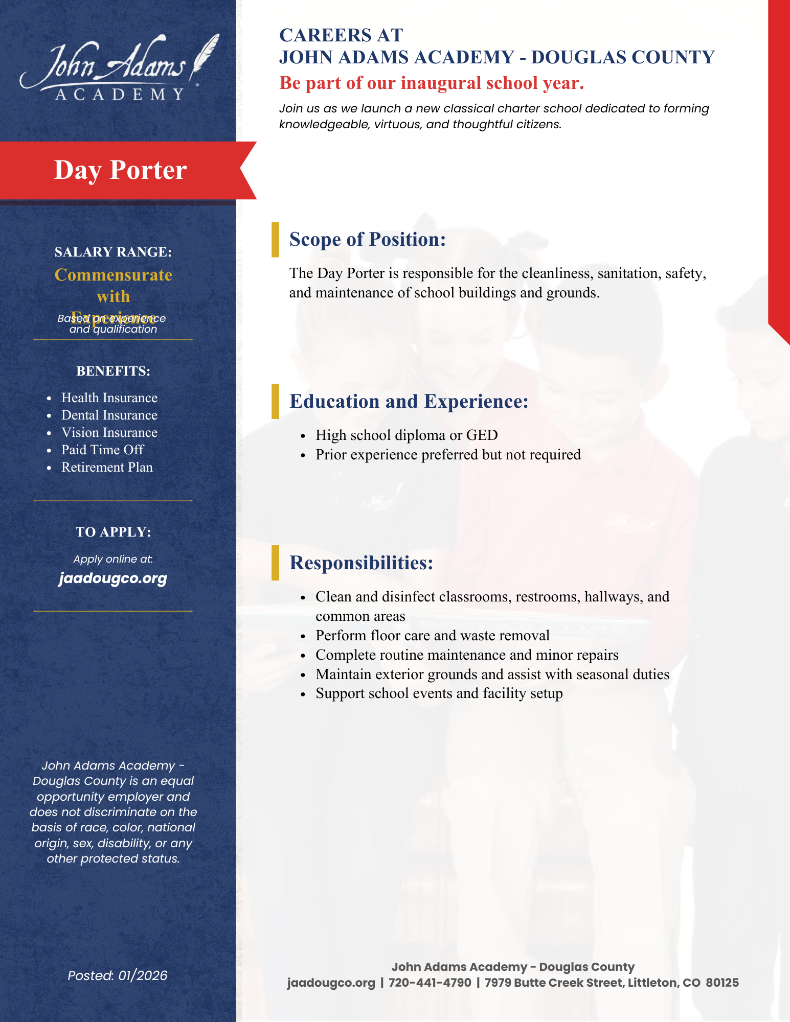 The Day Porter at John Adams Academy will: