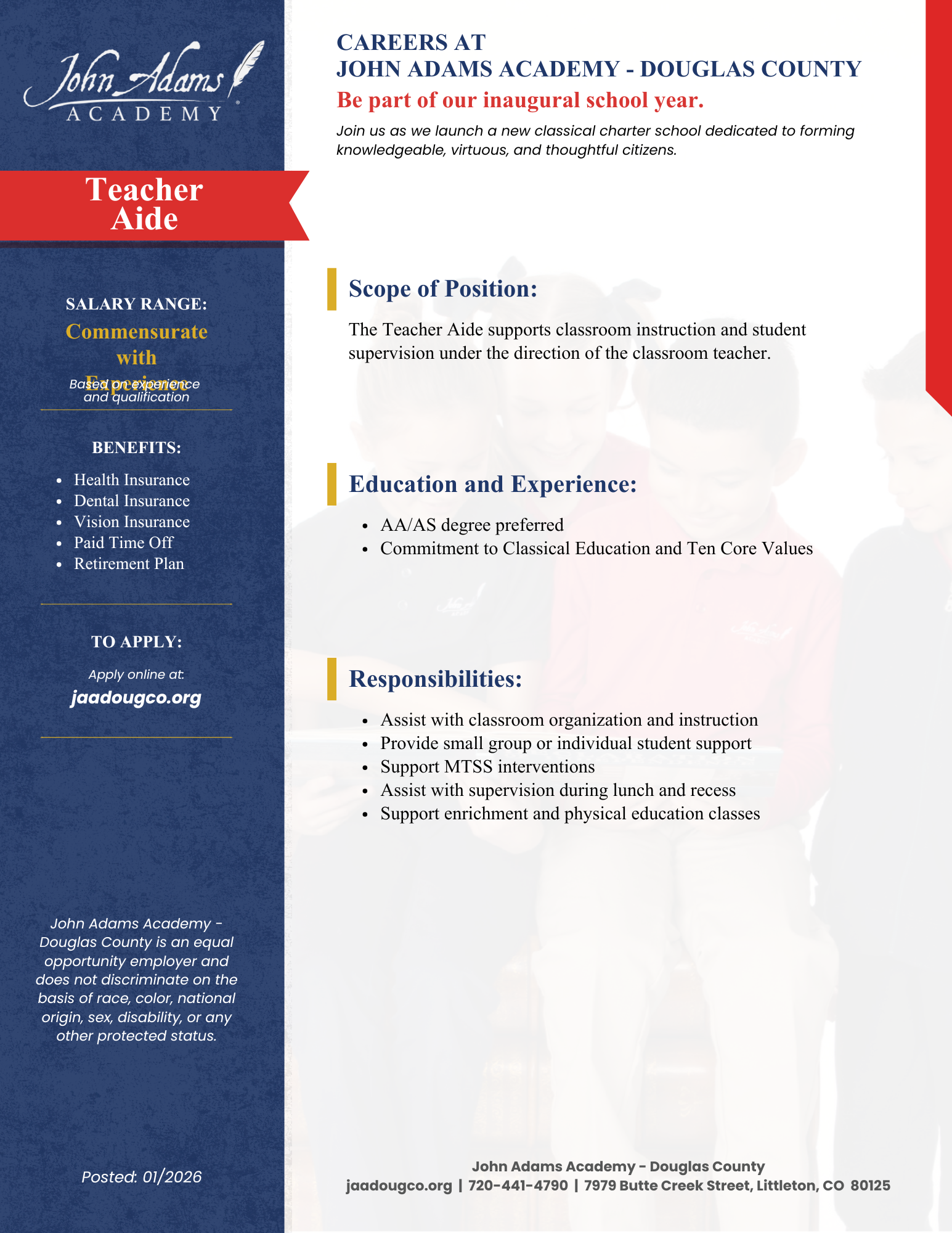 The Teacher Aide at John Adams Academy will: