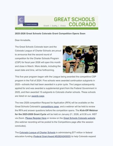 Nov 07, 2025 Twenty Schools Awarded Great Schools Colorado CSP Sub-Grants More than $24M in federal funding is awarded this year to support Colorado’s growing charter school sector
